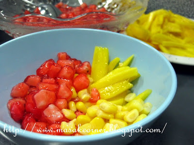6. Scope some water chestnuts into bowl, add the mango and sweet corn, finally pour the coconut sweet soup over it and the red ruby is ready to serve.